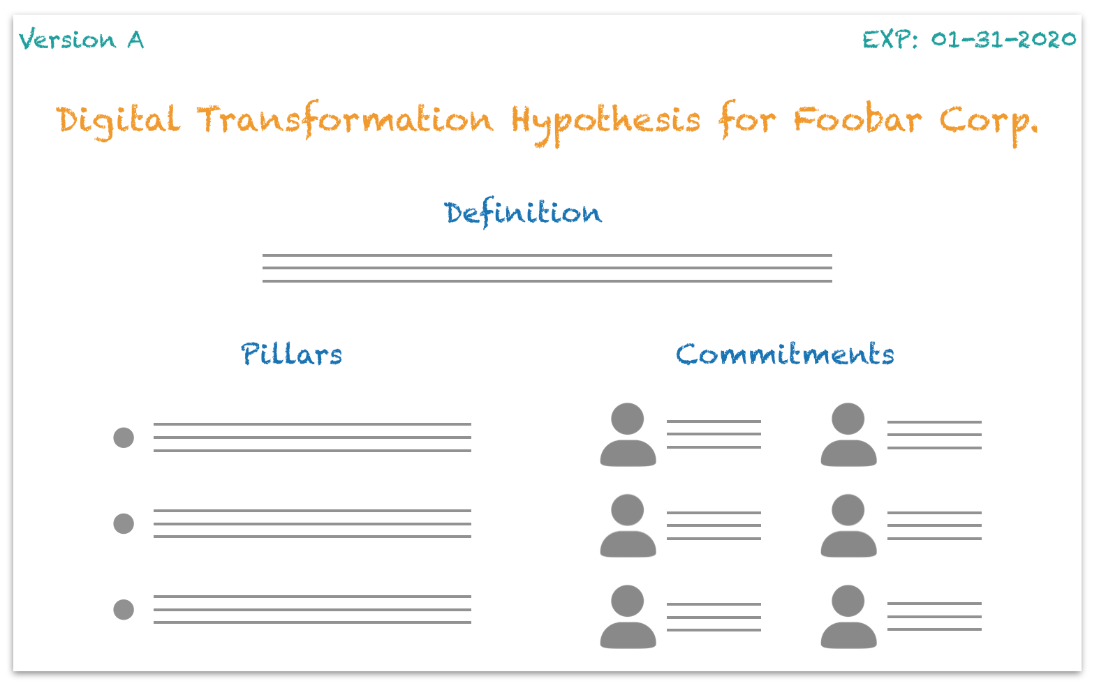 The organization leaders should define the hypothesis in a workshop called Visioning of Digital Transformation. The primary purpose is to confirm that all leaders agree about concepts, expectations and priorities. If they can’t define the hypothesis, it will be impossible for the rest of the organization to engage with any transformation initiative.