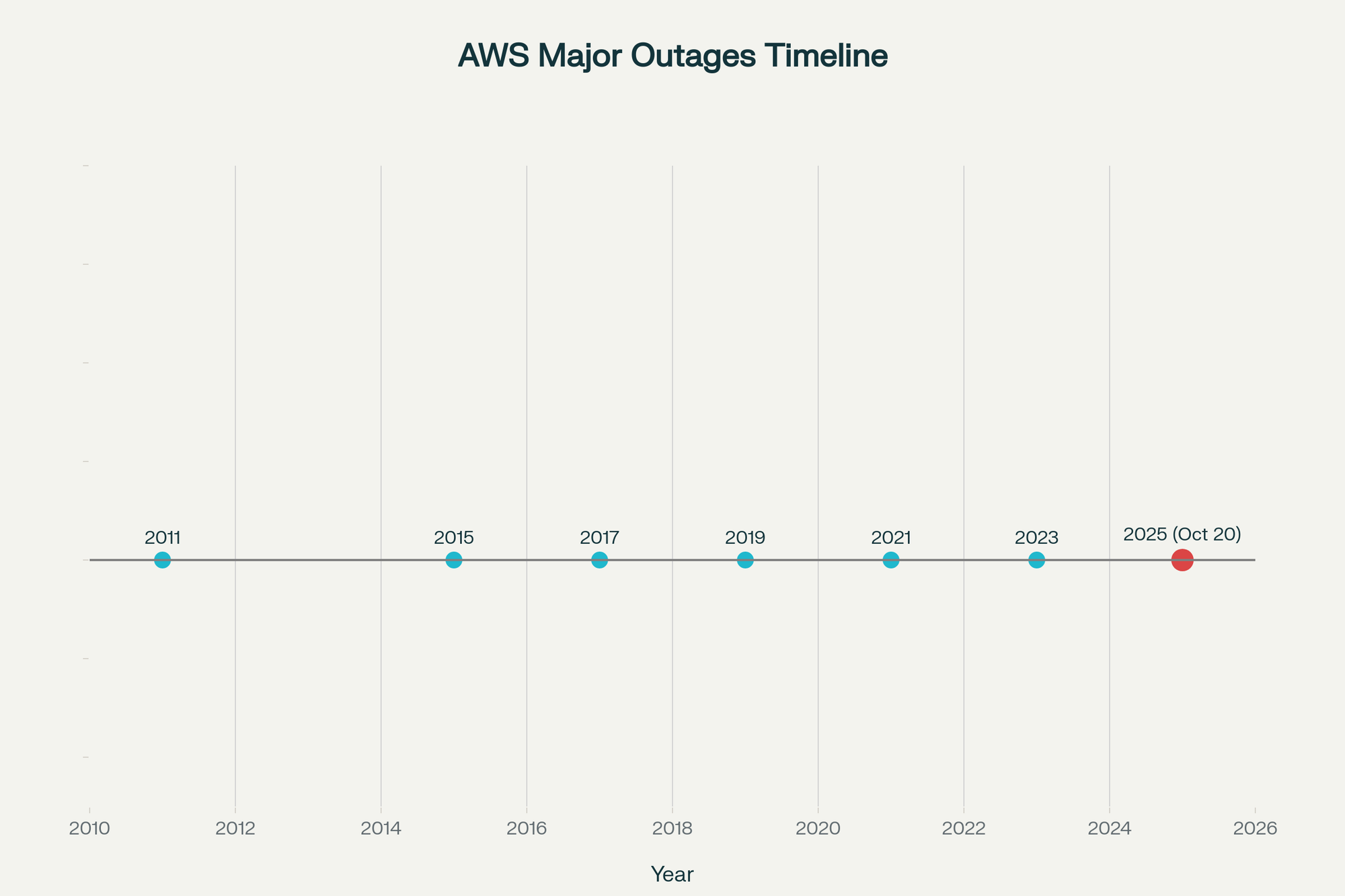 No system of meaningful scale is immune from failure. AWS has experienced only a handful of major outages in nearly two decades (2011, 2015, 2017, 2019, 2021, 2023, and now 2025). That track record, across billions of compute hours, is remarkably strong. But the complexity of modern digital infrastructure guarantees that outages will happen again—whether in the cloud or on-premise.